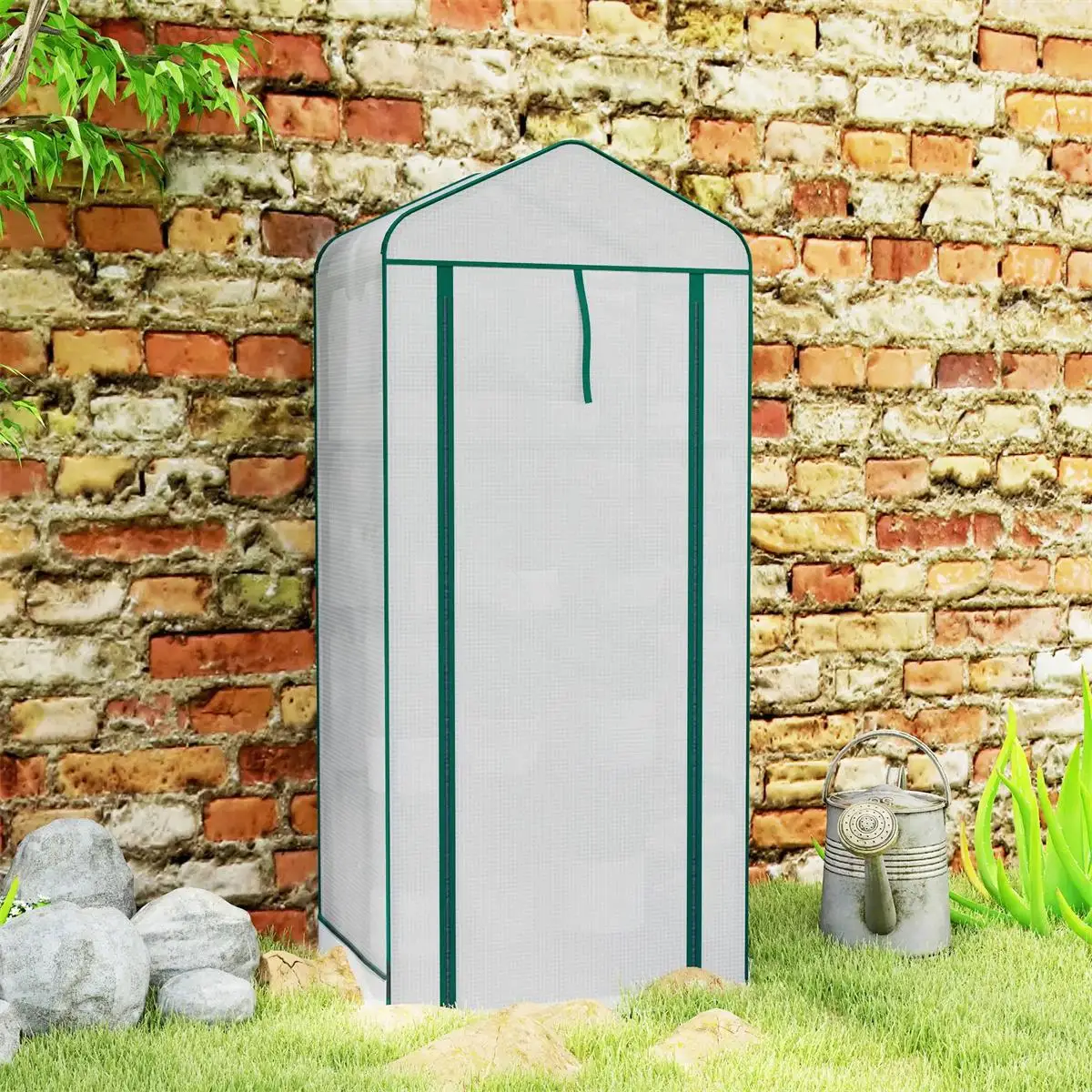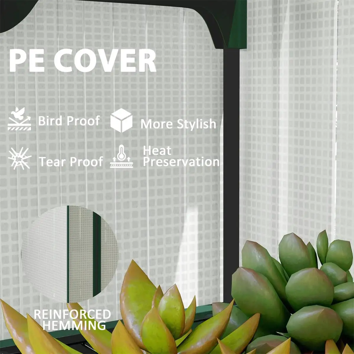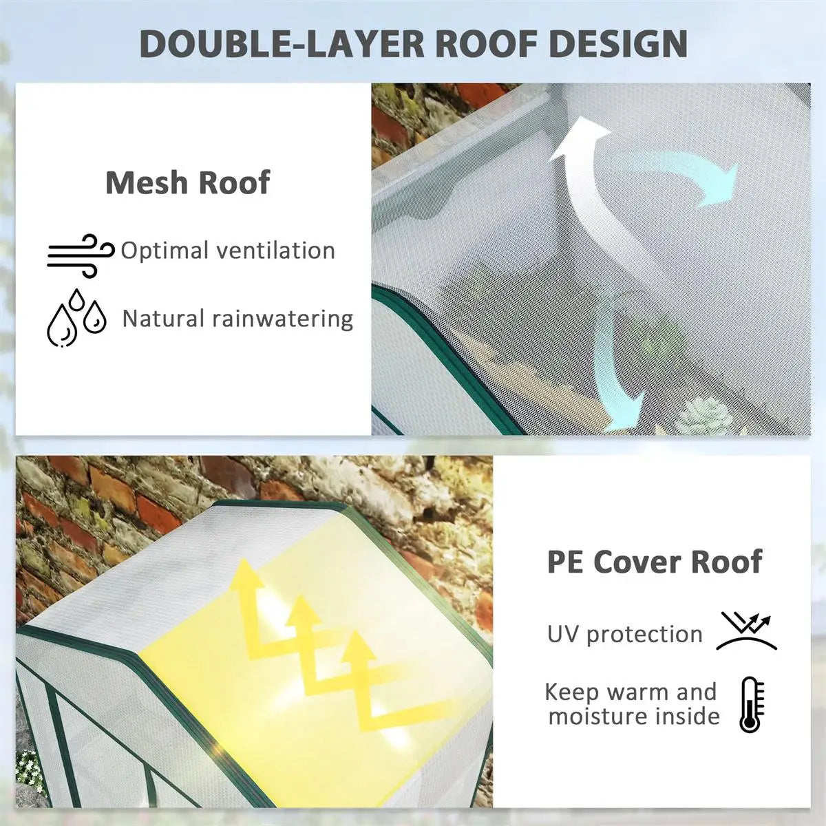 ● Double-Layer Roof Design: This outdoor greenhouse features a mesh roof on the top for enhanced ventilation and rainwater access while blocking small animals, complemented by a zip-up PE cover for optimal warmth and moisture retention