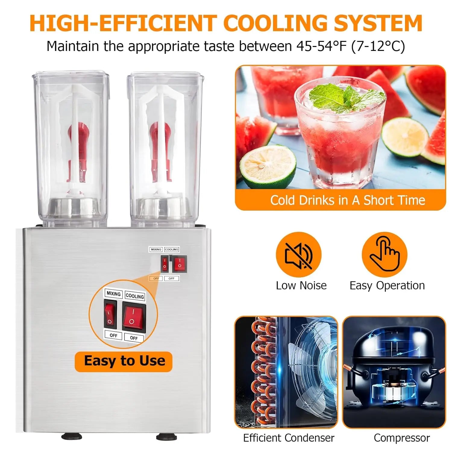 Temperature Control and High Efficiency: The evaporator tray design allows your cold beverage dispenser to be used even with a low volume, and the stirring design makes the beverage temperature more uniform. The compressor and pure copper condenser component provide fast cooling and high efficiency. The temperature control feature helps keep the beverage at a pleasant taste range of 41~53.6℉ (5~12℃), and the simple button switch allows easy setting of cooling and spraying functions.